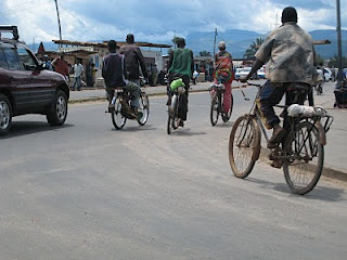 O centro da cidade preenche-se diariamente com gentes vindas dessas “colinas” (zonas rurais). Mas a cidade mantém um movimento fluído, com congestionamentos apenas a certas horas do dia e nas proximidades do alarido do mercado. Táxis azuis e brancos, carros, camiões, e motos preenchem o tráfego por entre as constantes bicicletas, que, de tudo, transportam um pouco. É uma cidade funcional e ordenada, de fácil orientação, diferente da confusão de muitas capitais africanas. Com um centro pequeno, composto por casas e prédios baixos, ao estilo da colonização belga, cada serviço, loja ou barraca improvisada tem a sua função e os seus clientes. Não faltam também os cibercafés que ao longo do dia se vão enchendo de jovens. Aqui servem-se refeições para além de se poder tomar o saboroso café do Burundi.