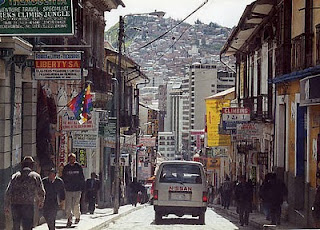 El río Choqueyapu cruza la ciudad, óyelo. En tu camino hacia la hoyada, mira cómo las casas parecen colgar de las laderas de los cerros, como si insistiesen en no quedar fuera de la fotografía que tomas: techos de calamina, paredes de ladrillos y muros de colores.