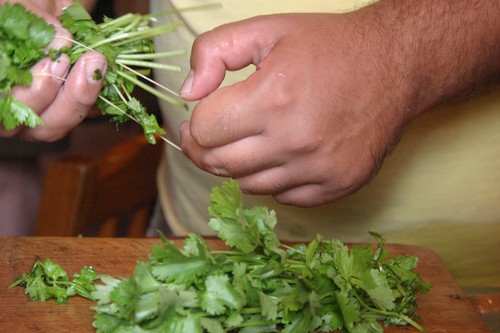 Coloque o óleo de palma num tacho e quando estiver bem quente adicione a cebola deixando refogar. Junte o cação cortado aos cubos e frite um pouco. Adicione 200 ml de leite coco e mantenha em lume médio de forma a cozinhar o cação. Durante esse processo, com a ajuda de uma colher de pau, pressione-o para que no final se desfaça. Quando este processo estiver concluído, adicione o pão previamente desfeito e demolhado no restante leite de coco e água. Adicione a salsa, os coentros moídos e o sal.