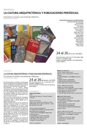 Em Santiago, na Universidade Católica do Chile, decorre até hoje (26 Jan) o Seminário de dois dias dedicado ao tema: “La Cultura Arquitectónica y Publicaciones Períodicas” (A Cultura Arquitectónica e Publicações Periódicas). Conta com a participação de 17 convidados nacionais e internacionais, entre os quais o arquitecto e editor Pablo Brugnoli, que em Junho passado apresentou em Lisboa, no Próximo Futuro, a sua lição sobre a “Ciudade Sur” (Cidade Sul).
