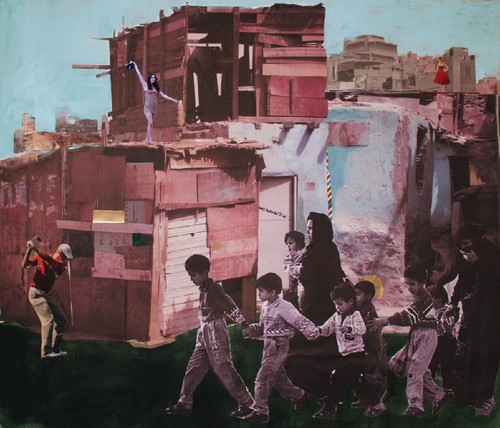 At Art Corner, a newish gallery in a Zamalek shop, two ink drawings lean casually against a wall. These are, I am told, the work of a French artist Paul Beanti, who came to paint the revolution and was arrested in Tahrir Square. The drawings give his account of arrest, attempted humiliation, striking back with satirical anger. The woman watching the gallery absent-mindedly whilst stringing a set of glass beads, goes to fetch one of Beanti’s paintings from the storeroom. When she returns, and the painting is removed from its bubblewrap, the exposed painting strikes me more than any of the other artists’ paintings on the walls: a composition in bright swathes of roughly applied orange, purple and yellow, the head of a sphinx emerges from within a haze of what looks like marker pen. The artist used sand and soil to give his work its roughness. The work made during his stay suggests he viewed his role as a foreign artist in residence in Cairo as that of agent provocateur (an interview in al-Ahram dutifully mentions that the artist’s main fascination – in his own [admittedly circumcised] genitalia – makes his work unacceptable in Egypt). These paintings look naked, aggressively so, insistently naïve. I wonder what art this revolution really needs.